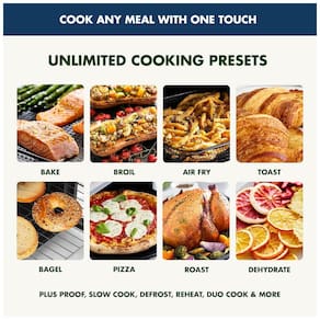 Design Multifuncional: Versátil para qualquer receita, com funções de assar, grelhar, air fry, tostar, preparar bagels, pizza, assar carnes, desidratar, fermentar, cozinhar lentamente, descongelar, Duo Cook e muito mais. Um verdadeiro aliado na cozinha!