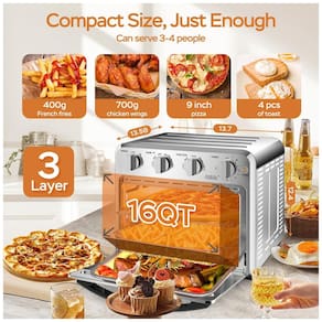 Descrição do Produto: Atenda às necessidades de toda a família com o Forno Air Fryer Geek Chef de 16 litros, que combina versatilidade e eficiência para preparar pratos deliciosos. Com capacidade de 16 litros e 3 camadas para cozimento uniforme, ele é ideal para assar até 4 fatias de pão, uma pizza de 23 cm, ou 700 g de asas de frango, perfeito para refeições familiares e jantares festivos.