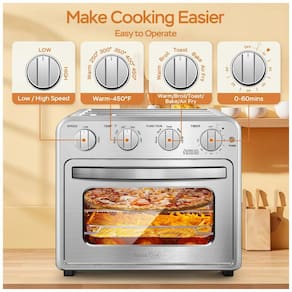 Cozimento Multifuncional: Equipado com quatro botões de controle – timer, temperatura, função e velocidade – o forno é fácil de operar para todas as idades. Com funções para assar bolos, frango, peixe, pizza, carne, torradas e até fritas, este aparelho multifuncional é perfeito para uma grande variedade de receitas.