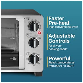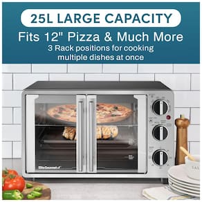 Forno elétrico de bancada com porta dupla francesa, 25 litros de capacidade, 1500W de potência, termostato ajustável de 93°C a 232°C, timer de 60 minutos com campainha, grelha e bandeja de assar inclusas. Material externo e porta em aço inoxidável e vidro temperado. Material interno em aço inoxidável.Forno autolimpante