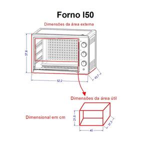 Características Capacidade 50 Litros Timer de 120 minutos Termostato até 250°C Bandeja para resíduos Grade Interna Luz piloto Indica se o forno está ligado Grill e Dourador Interior Antiaderente