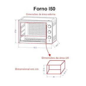 Características Capacidade 50 Litros Timer de 120 minutos Termostato até 250°C Bandeja para resíduos Grade Interna Luz piloto Indica se o forno está ligado Grill e Dourador Interior Antiaderente