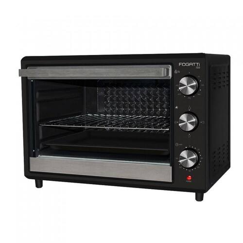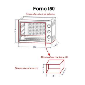 Forno de bancada com capacidade de 50 litros. Possui timer de 120 minutos, termostato até 250°C, bandeja para resíduos, grade interna, luz piloto, grill e dourador. Interior antiaderente.Forno autolimpante