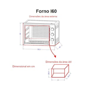 Características do Produto: Capacidade 60 Litros Timer de 120 minutos Termostato até 250C Bandeja para resíduos Grade Interna Luz piloto Indica se o forno está ligado Grill e Dourador Interior Antiaderente Frequência entre 60 Hz Potência resistência Superior 800 W Potência resistência Inferior 1000 W Potência total 1800 W Consumo 1,2 kWh Corrente 15 A para 127 V e 8,5 A para 220 V Tomada para fornos 220 V devem ser de 10 A Tomada para fornos 127 V devem ser de 20 A