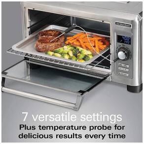 A FUNÇÃO SURE CRISP AIR FRY CIRCULA O AR COM POTÊNCIA DOS ALIMENTOS PARA RESULTADOS CRISPY. Este forno torradeira de fritadeira de ar fornece crocante, até mesmo tostar com pouco ou nenhum óleo, tornando o ideal para batatas fritas, asas de frango, bifes, peixes, vegetais e muito mais. 7 CONFIGURAÇÕES VERSÁTEIS MAIS SONDA PARA COZEDURA MULTI FUNCIONAL. Passe de fritar frango no ar na sexta feira para assar carne assada com a sonda no domingo. Configurações adicionais para torradas, bagel, pizza, assar, grelhar e manter aquecido fornecem versatilidade de cozimento. COZINHE AS REFEIÇÕES FAMILIARES O grande forno de bancada permite que você cozinhe uma pizza de , 2.7L de frango, 6 fatias de torrada ou uma panela de 22 x . Ele também tem 3 posições de prateleira para acomodar uma variedade de necessidades de cozimento. CONTROLES DIGITAIS PREMIUM PARA UM COZIMENTO PRECISO. O painel de controle intuitivo com tela LCD exibe qual configuração você selecionou, quantos minutos faltam no cronômetro e a temperatura do forno. Terminado o tempo de cozedura, o forno desliga se. FORNO TORRADEIRA COM EXCELENTE DESEMPENHO Elementos de aquecimento de quartzo de qualidade, 1500 watts e ventilador de convecção poderoso fornecem temperaturas precisas e precisas de 200 a 450 F 93 a 232 C e resultam em um cozimento uniforme sem pontos quentes