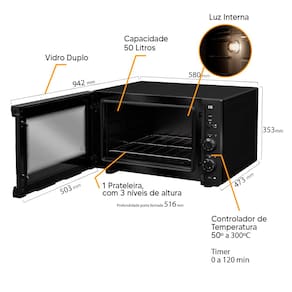 Forno elétrico de bancada com 50 litros de capacidade, sistema de aquecimento superior e inferior com grill, vidro duplo na porta, controle de temperatura de até 300°C, timer de 120 minutos com aviso sonoro, luz interior, acabamento interno Total Clean, resistências blindadas, isolamento térmico total, janela de exaustão, classificação de eficiência energética A.Forno autolimpante