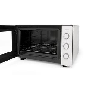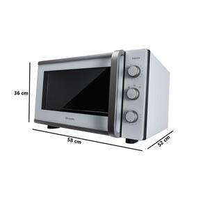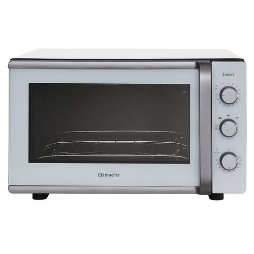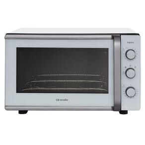 Forno elétrico de bancada Mueller Sapore com capacidade de 44 litros, timer sonoro com autodesligamento, luz interna, porta com vidro duplo, isolamento térmico, três modos de cozimento e grill dourador.Forno autolimpante