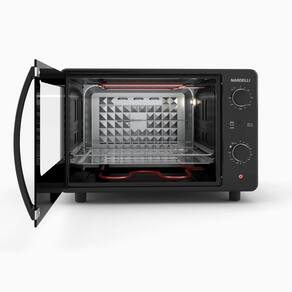 Forno de bancada com prateleira fixa, luz interna, revestimento 'limpa fácil', controle de temperatura de 50°C a 300°C, função grill, timer de até 120 minutos, porta de vidro panorâmico, isolamento térmico.Forno autolimpante