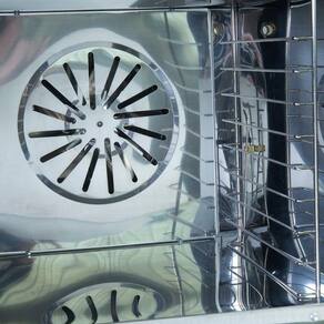 Fabricado integralmente em aço (interno em aço inox brilhante, externo em aço inox escovado e rack em aço carbono niquelado);
