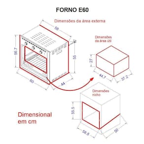 Dimensoes externas do produto A 56,7 cm x L 60 cm x P 44 cm Dimensoes internas do produto A 27 cm x L 44,7 cm x P 37,2 cm Dimensoes nicho A 55,5 cm X L 58,8 cm X P 50 cm Espaco interno 60 Litros Peso 19,5 kg
