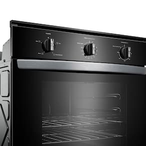 Forno de embutir com design moderno em preto, 84L de capacidade, timer com desligamento automático, grill elétrico, 2 prateleiras com 5 alturas ajustáveis e revestimento esmaltado para fácil limpeza.Timer
