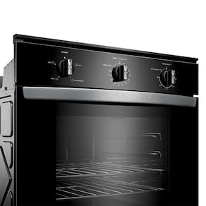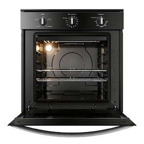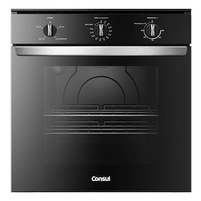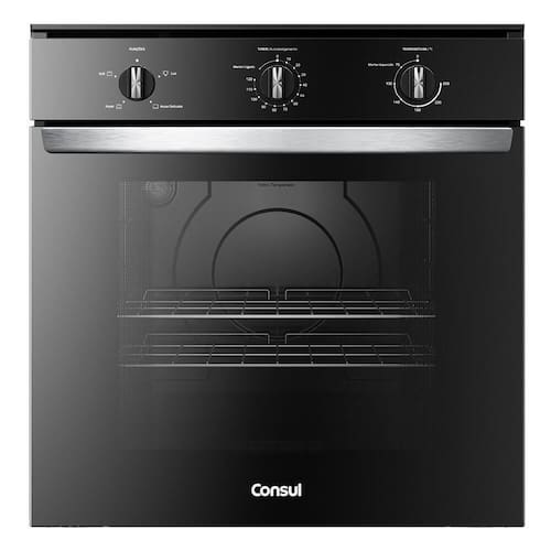 Forno elétrico de embutir Consul 84L, com painel de controle mecânico, timer analógico com desligamento automático, termostato ajustável de 75°C a 250°C, função manter aquecido, grill elétrico, lâmpada interna, porta removível com 2 vidros, acabamento interno esmaltado e puxador em alumínio. Inclui 2 prateleiras deslizantes com 5 alturas ajustáveis.Forno autolimpante