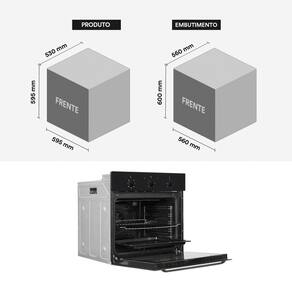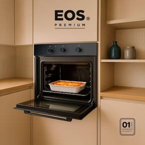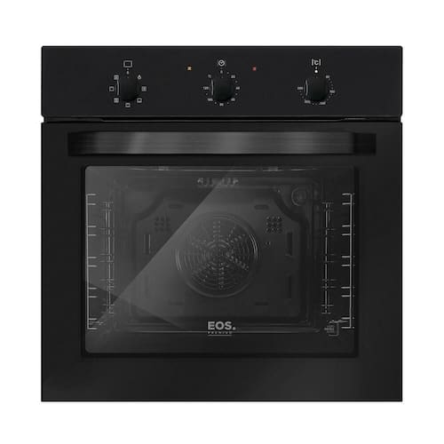 Forno Elétrico de Embutir EOS 65L com convecção, acabamento em vidro all black, 7 funções de cozimento, painel mecânico com timer de 120 minutos, porta com vidro duplo removível e interior com esmalte embossado.Timer