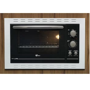 O Forno Elétrico Fischer Fit Line de Embutir apresenta controle automático de temperatura, timer de 0 a 2 horas com aviso sonoro, lâmpada interna, dourador, controle automático de temperatura, isolamento térmico total, bandeja para resíduos esmaltada, grade cromada removível e porta com vidro duplo que impede a