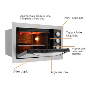 Forno elétrico de embutir com 48 litros de capacidade, frontal em inox escovado, 3 funções de aquecimento (superior, inferior e total), controle automático de temperatura de 50°C a 320°C, timer programável de até 120 minutos com aviso sonoro, lâmpada interna com proteção de vidro, porta com vidro duplo serigrafado, corpo interno com revestimento autolimpante, grade cromada removível e bandeja esmaltada para resíduos removível.Forno autolimpante