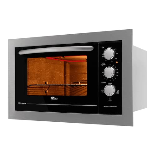 O novo Forno Elétrico de Embutir Fischer FIT 48 litros, conta com um novo frontal em aço carbono ou inox, dourador, isolamento térmico total, bandeja para resíduos esmaltada, grade cromada removível, bandeja coletora de resíduos e porta com vidro duplo que impede a fuga de calor e economiza energia.
