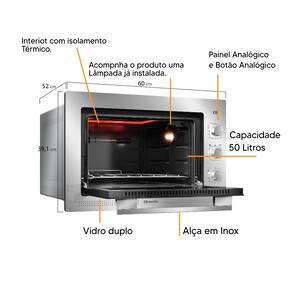 Forno elétrico digital de embutir com 50 litros de capacidade. Painel digital com controle por toque. Potência total de 1800W. Controle de temperatura de 100°C a 300°C. Função grill. Timer de dupla função (contínuo ou até 120 minutos) com alarme sonoro. Interior com acabamento em esmalte Total Clean. Porta com vidro duplo. Iluminação interna. 1 prateleira com 3 níveis de altura. Bandeja para resíduos. Janela de exaustão.Forno autolimpante