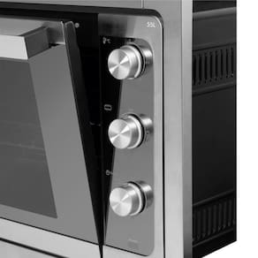 Forno Elétrico de Embutir Philco PFE55E com capacidade de 55 litros, temperatura máxima de 230°C, timer de 120 minutos com desligamento automático, função manter ligado, luz interna e bandeja coletora de resíduos.Timer