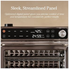 Forno elétrico digital Our Place Wonder Oven Pro 30L une alta capacidade familiar e versatilidade em oito funções: air fry, assar, tostar, gratinar, desidratar, fermentar, reaquecer e vaporizar. O painel touchscreen intuitivo permite controle preciso de tempo e temperatura. O sistema de aquecimento em quartzo e aço inox proporciona resultados uniformes e até 40% mais rápidos, alcançando até 232°C. Interior livre de químicos PFAS — não tóxico, seguro para o preparo diário. Possui três níveis de prateleiras e acessórios de longa duração: bandeja de assados, cesta de air fryer, prateleiras de arame e bandeja de migalhas. Indicado para refeições de grandes volumes, uso doméstico intenso e fácil de limpar.