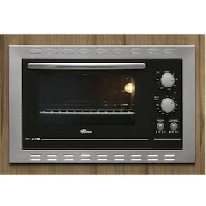 Design moderno em inox escovado, o Forno Elétrico Fischer Fit Line de Embutir apresenta controle automático de temperatura, timer de 0 a 2 horas com aviso sonoro, lâmpada interna, dourador, controle automático de temperatura, isolamento térmico total, bandeja para resíduos esmaltada, grade cromada removível e porta com vidro duplo que impede a fuga de calor e economiza energia.