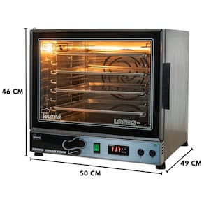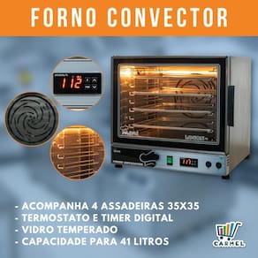 O Forno convector tem entrada para 8 assadeiras 35x35cm e vidro temperado. Com corpo em inox escovado, controle digital de temperatura e tempo, juntando praticidade e eficiência.