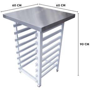 A Mesa Bancada desmontável possui estrutura confeccionada com perfil dobrados tipo L e soldados em aço carbono, com espessura de 1,20 e 0,90mm e 0,75mm. Com tampo 60x60 em aço inox AISI 430 de 0,50mm de espessura e capacidade para 8 assadeiras 35x35. É ideal para dar suporte ao seu forno!