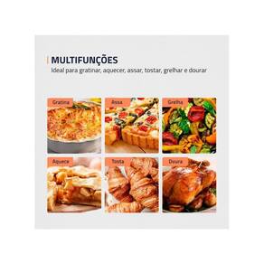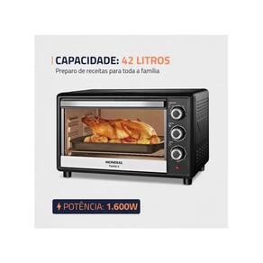 :: Instalação do Eletrodoméstico - De bancada :: Alimentação do Eletrodoméstico - Elétrico :: Capacidade - 42L :: Acendimento - Automático :: Material - PP, Aço Inox e Vidro :: Funções do Eletrodoméstico - Gratina, assa, grelha, aquece, tosta e doura :: Temperatura - 100 a 250ºC :: Mecanismo de Segurança - Timer de 90 minutos com aviso sonoro :: Potência - 1600W :: Voltagem - 127V e 220V :: Consumo Aproximado de Energia - 1,6Kw/h :: Cor - Preto e Inox :: Peso do Produto - 5,99kg :: Peso do Produto com Embalagem - 7,38kg