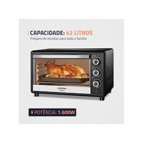 :: Instalação do Eletrodoméstico - De bancada :: Alimentação do Eletrodoméstico - Elétrico :: Capacidade - 42L :: Acendimento - Automático :: Material - PP, Aço Inox e Vidro :: Funções do Eletrodoméstico - Gratina, assa, grelha, aquece, tosta e doura :: Temperatura - 100 a 250ºC :: Mecanismo de Segurança - Timer de 90 minutos com aviso sonoro :: Potência - 1600W :: Voltagem - 127V e 220V :: Consumo Aproximado de Energia - 1,6Kw/h :: Cor - Preto e Inox :: Peso do Produto - 5,99kg :: Peso do Produto com Embalagem - 7,38kg
