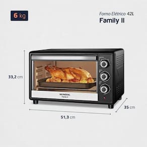Agora voce pode fazer aquela receita tamanho familia sem preocupacao. O forno eletrico Family II FR-42 da Mondial possui capacidade para 42 litros e e perfeito para aquecer, cozinhar, tostar, assar, gratinar e grelhar de maneira eficiente. Possui controle de temperatura, grelha com regulagem de altura, timer de 90 minutos com desligamento automatico e alta potencia de 1600W.