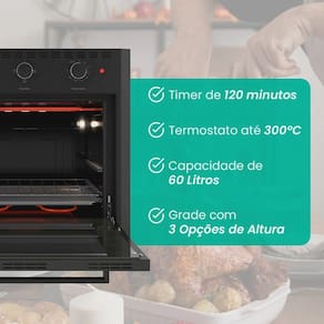O Forno Elétrico de Embutir Black possui capacidade de 60 Litros, que permite preparar assados em maior quantidade com mais comodidade, e porta de vidro possibilitando o acompanhamento dos assados com mais segurança. Dispondo de Função Grill, tenha seus alimentos dourados e crocantes, do jeito que você mais gosta.