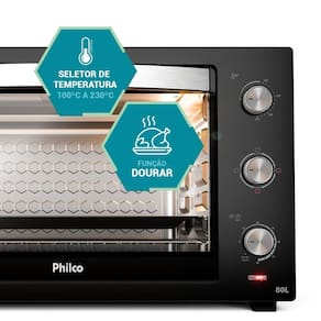 Forno elétrico de bancada com 4 resistências (2 superior e 2 inferior), 4 funções (Somente resistência inferior, somente resistência superior, ambas acionadas), temperatura ajustável de 100°C a 250°C, timer de 90 minutos com desligamento automático, grelha em aço cromado com 5 níveis de ajuste de altura, bandeja coletora, revestimento interno esmaltado e porta de vidro.Forno autolimpante