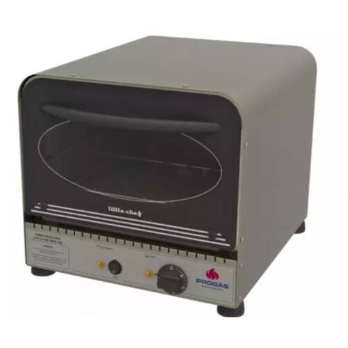 Forno Elétrico Progás Little Chef Inox, ideal para uso doméstico ou comercial leve. Design compacto, porta de vidro temperado, controle de temperatura ajustável e isolamento térmico eficiente.Bandeja para resíduos
