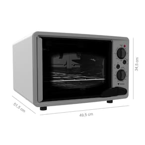 Tipo: Forno de bancada Marca: Venax Luz no forno: Sim Prateleira do forno: 1 regulável Revestimento forno: Limpa fácil Controle de temperatura: Sim Temperatura: 50C até 300C Função grill: Sim Timer grill: até 120 min Espeto giratório: Não Bandeja coletora de resíduos: Sim Porta do forno: Vidro Panorâmico Preto Vidro duplo na porta: Não Porta com travamento mecânico: Sim Porta removível: Não Puxador da porta: Não Medidas do produto: Altura 34,5cm - Largura 49,5cm - Profundidade 51,5cm