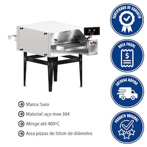 O Forno de Esteira Saro pode assar até 210 pizzas pré-assadas por hora, 90 pizzas com massa crua por hora, ou até 1.600 esfihas com massa crua, permitindo alta produtividade em ambientes de grande demanda.