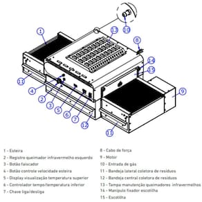 INFORMAÇÕES GERAIS DO FORNO ESTEIRA PARA PIZZA 220V - A gás - Baixa pressão - Controle de velocidade - Elétrico / 220V - Temporizador digital - Consumo médio: 0,36 kg/h (por queimador)