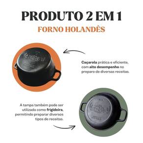 Forno holandês fabricado em ferro fundido, indicado para o preparo de assados, cozidos, pães, bolos, carnes e ensopados, proporcionando cozimento uniforme, excelente retenção de calor e sabor tradicional. Pode ser utilizado diretamente sobre a chama, no forno ou sobre a brasa, oferecendo versatilidade e alto desempenho tanto em ambientes domésticos quanto profissionais. O ferro fundido mantém a temperatura estável por longos períodos, garantindo resultados consistentes e preparo eficiente.