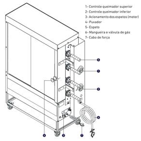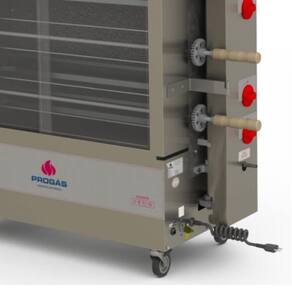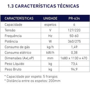 INFORMAÇÕES TÉCNICAS - Estrutura externa em inox escovado 430. - Costa interna esmaltada. - Porta em vidro temperado. - Com gaveta coletora de gordura que facilita o manuseio e a limpeza. - Com rodízios que facilitam o deslocamento. - Controle progressivo de chama máxima e mínima. - Aquecimento a gás através de queimadores tubulares. - Modelo PR 634: 4 queimadores TUBULARES. - Manipulador controlador gás. - Bacia interna em inox. - Baixa pressão. - Entrada de gás na lateral. - Número de Espetos: 6. - Distância entre os espetos: 20 cm. - Espeto tipo garfo. - Capacidade de Frangos: Aproximadamente 30; - Capacidade em Quilos: Aproximadamente 60 Kg; - Equipamentos BIVOLT tensão 127/220v; - Frequência: 50/60 Hz. - Motor monofásico de 1/4cv; - Potência: 360- 275 Watts. - Consumo Médio Elétrico: 0,38 Kw/h. - Consumo de gás: 1,49 Kg/h.
