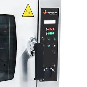 DETALHES DO FORNO INDUSTRIAL VENÂNCIO - Máximo em tecnologia de cocção; - Funções disponíveis no controlador: SECO - COMBINADO - VAPOR REGULÁVEL - REGENERAÇÃO; - Cozinhe vários tipos de alimentos ao mesmo tempo, sem mesclar sabores; - Economize substituindo vários equipamentos por um só; - Modelo para 3 GNs, com cavalete como acessório opcional; - Controlador de fácil operação (Easy Control) e de fácil visualização, com diagnóstico de operação em frases escritas, sem usar códigos ou números. - Sistema de lavagem Bio Wash; - Sensor de núcleo tem como função determinar o ponto do cozimento (mal passado, bem passado ou ao ponto), pois irá efetuar a medição através de uma sonda inserida no interior do alimento; - Entrada USB para incluir novas receitas na memória do forno; - Forno monofásico na voltagem de 220V; - Acessórios como GNS e Cavalete são vendidos separadamente; - Equipamento para uso industrial e profissional;