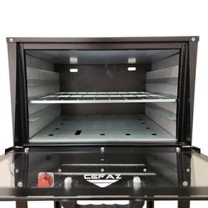 Forno Profissional Médio com Cavalete Alta Pressão Tampa de Vidro Marca Cefaz O Forno Profissional Cefaz 80 Litros conta com sistema de gás GLP Alta Pressão e queimador em serpentina tubular 7/8”, as laterais do forno externo em aço carbono com pintura epóxi na cor preta, sua Tampa de Vidro temperado com puxadores em baquelite, e seu acabamento interno em chapa minimizadaPara melhor aquecimento seu isolamento é produzido com lã de rocha aplicado nas laterais, e tampa chegando até 250°, assim aumentamos mais sua caloria interna e reduzimos a caloria externa! Contém sistema de botão regulador de gás para o controle da chama. Acompanha 1 Grelha contendo 3 níveis de altura. Ideal para Bolos, massas, pães, carnes, peixes e outros vários tipos de alimentosInformações Técnicas - Modelo: FRG-10- Alimentação: Gás GLP Alta Pressão- Temperatura máxima de até 250 graus- Cor: Preto- Capacidade 80 litros - Forno com visor de vidro temperado- Acabamento interno em chapa minimizada- Acabamento externo em aço carbono pintado- Isolamento em Lã de Rocha- Cavalete em aço carbono pintado- Acompanha 1 grelha- Consumo de gás 0,380kg/hMedida Interna do Forno Altura: 31cmLargura: 51,5cmComprimento: 50cmMedida externa do forno montado com cavalete Altura: 135cmLargura: 63cmComprimento: 57cmPeso:26,3kgGarantia3 meses contra defeito de fabricação