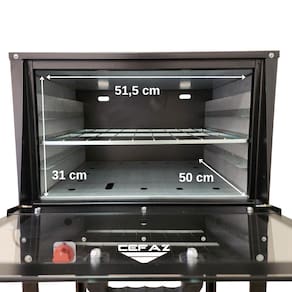 Forno Profissional Médio com Cavalete Baixa Pressão Tampa de Vidro Marca Cefaz O Forno Profissional Cefaz 80 Litros conta com sistema de gás GLP Baixa Pressão e queimador em serpentina tubular 7/8”, as laterais do forno externo em aço carbono com pintura epóxi na cor preta, sua Tampa de Vidro temperado com puxadores em baquelite, e seu acabamento interno em chapa minimizada Para melhor aquecimento seu isolamento é produzido com lã de rocha aplicado nas laterais, e tampa chegando até 250°, assim aumentamos mais sua caloria interna e reduzimos a caloria externa! Contém sistema de botão regulador de gás para o controle da chama. Acompanha 1 Grelha contendo 3 níveis de altura. Ideal para Bolos, massas, pães, carnes, peixes e outros vários tipos de alimentos.Informações Técnicas - Modelo: FRG-08- Alimentação: Gás GLP Baixa Pressão- Temperatura máxima de até 250 graus- Cor: Preto- Capacidade 80 litros - Forno com visor de vidro temperado- Acabamento interno em chapa minimizada- Acabamento externo em aço carbono pintado- Isolamento em Lã de Rocha- Cavalete em aço carbono pintado- Acompanha 1 grelha- Consumo de gás 0,380kg/hMedida Interna do FornoAltura: 31cmLargura: 51,5cmComprimento: 50cm Medida externa do forno montado com cavalete Altura: 135cmLargura: 63cmComprimento: 57cmPeso: 26,3kg Garantia 3 meses contra defeito de fabricação