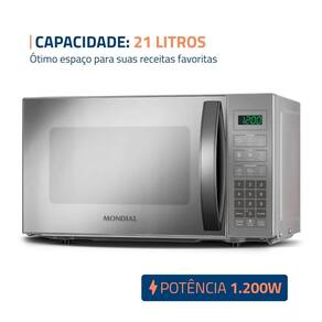 Micro-ondas com capacidade de 21 litros, 1200W de potência, Display Digital, Menu Dia a Dia, Menu Kids, Função Descongelar, Função Manter Aquecido, 10 Ajustes de Potência, Função Tira Odor, Trava de Segurança, Design Compacto, QR Code de Receitas Mondial.Função Grill