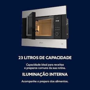 Com alta potência e performance, o micro-ondas aquece e cozinha os alimentos rapidamente, garantindo grande eficiência e uniformidade. Possui capacidade de 23 litros, ideal para o preparo de receitas e refeições do dia a dia.