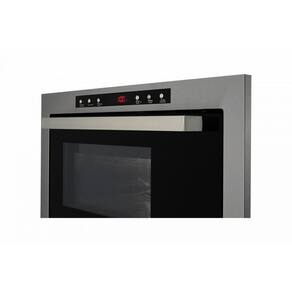 O forno conta com uma moldura com saída de ar na parte superior, proporcionando ventilação interna para resfriamento dos componentes. A estrutura do forno possui acabamento externo pintado na cor prata e interno em aço inox polido. A porta de vidro preto e o puxador com acabamento polido completam o design moderno.