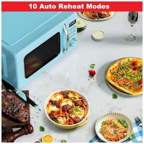 O design retrô em azul, com puxador cromado e cantos arredondados, acrescenta um elemento decorativo à bancada sem ocupar muito espaço, com dimensões em torno de 44,6 cm (largura) x 35,9 cm (profundidade) x 24,0 cm (altura). A cavidade interna conta com iluminação, prato giratório removível e superfícies de fácil limpeza após o uso.?