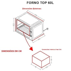 Forno de bancada com 60 litros de capacidade. Possui timer de 120 minutos, controle de temperatura até 300°C, dourador, bandeja e grade removíveis, luz interna com lâmpada e protetor, luz piloto, interior esmaltado Easy Clean, isolamento térmico e design exclusivo. Compacto, prático e moderno.Forno autolimpante