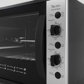 Forno Terim Elétrico Bancada Smart60 Black Com Espeto 60l Preto 220v Inovamos com a chegada do Smart60's na Terim. Com 60 litros, o forno Smart 60's Black e muito pratico e moderno, um forno de bancada que alem de possibilitar o preparo de diversos pratos, ainda possui Espeto Giratorio para assar pecas inteiras. Possui timer de 120 minutos, possibilitando uma programacao eficaz para seus pratos e assados. A bandeja e grade sao removiveis e o forno acompanha um pegador que facilita a retirada do espeto apos o alimento estar assado. O controle de temperatura permite escolher a temperatura desejada ate 300 graus, alem de possuir o dourador, que doura seus alimentos e os deixa com aspecto muito mais saboroso. Seu interior e esmaltado Easy clean, que facilita a limpeza. Caracteristicas Forno Terim Eletrico Espeto Giratorio Forno de Bancada Espaco interno 60 Litros Timer de 120 minutos Termostato ate 300 graus Bandeja para residuos Grade Interna Luz piloto Indica se o forno esta ligado Grill e Dourador Interior Easy Clean, Esmaltado Isolamento termico Pes antiderrapantes Acompanha um pegador para remover o espeto Possui comando individual para acionar resistencia superior, grill ou inferior. Podendo acionar ambas juntas. Frequencia entre 50 e 60 Hz Potencia resistencia Superior 750 W Potencia resistencia Inferior 1000 W Potencia total 1750 W Consumo 1,2 kWh Tomada para fornos 220 V devem ser de 10 A Tomada para fornos 127 V devem ser de 20 A Padroes especificados e de acordo com as normas do Inmetro
