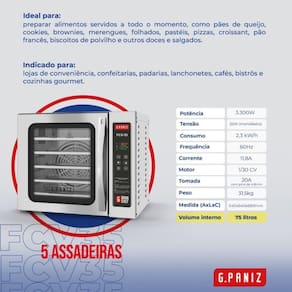 Forno Turbo Elétrico De Convecção Com Vapor Fcv35 220V Gpaniz FCV-35 - GranChef - Com Vapor Ideal para preparar alimentos servidos a todo o momento como pães de queijo, cookies, brownies, merengues, folhados, pastéis, pizzas, croissants, pão francês 50g , biscoitos e outros doces e salgados de tamanho pequeno ou médio.