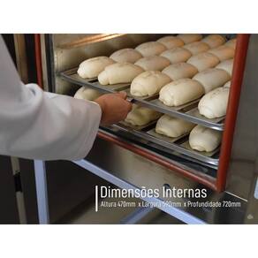 DESCRIÇÃO - Este equipamento é utilizado para produção de pães e doces, proporcionando um cozimento uniforme. - Projetado com sistema de gaveta fixa de aquecimento com circuito (GLP) gás em baixa pressão e sistema integrado de aquecimento, que proporciona maior segurança, baixo consumo, facilidade de manuseio, praticidade na manutenção e eficiência no trabalho. - Capacidade de cozimento: 5 esteiras de 580 x 700 mm com 25 pães de 50 g cada, totalizando 125 pães por fornada. Em uma hora, produz 375 pães de 50g. Obs.: O espaço entre as esteiras deve ser de 85 mm a 105 mm.