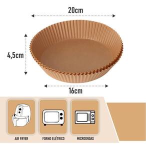 Especificações: Uso: Air Fryers de 3 a 5 Litros Contém 50 papéis descartáveis Medidas: 20 diâmetro borda x 16 diâmetro fundo x 4,5 altura Temperatura máxima suportada: 230C Cor: Bege