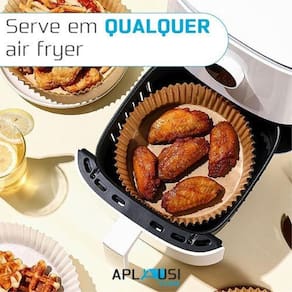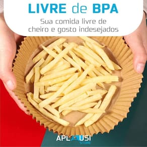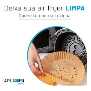pois seus problemas acabaram a solução ideal para preparar o seu alimento saudável dentro da air fryer sem ter que fazer o trabalho chato de limpeza dela depois. O papel de air fryer evita o contato direto do alimento com a bandeja do air fryer. Dessa forma, acaba protegendo o seu equipamento dos resíduos dos alimentos, gorduras e temperos. Além disso, traz economia de tempo na limpeza e não afeta em nada no sabor do alimento. Após o uso, basta apenas descartá-lo no lixo. O formato do nosso papel se assimila a uma forma redonda e se encaixa muito bem nos air fryers do mercado, atendendo os equipamentos de 3 a 5 litros. O papel é muito fácil de usar uma vez que já vem no formato de uma forma sendo necessário apenas colocar o alimento dentro e inserir dentro da air fryer. Por questão de segurança, recomendamos nunca ultrapassar a temperatura acima de 220 graus do seu air fryer. Além do uso em air fryers, também pode ser utilizado também dentro de fornos, microondas, panelas vaporizadoras também. Atenção: